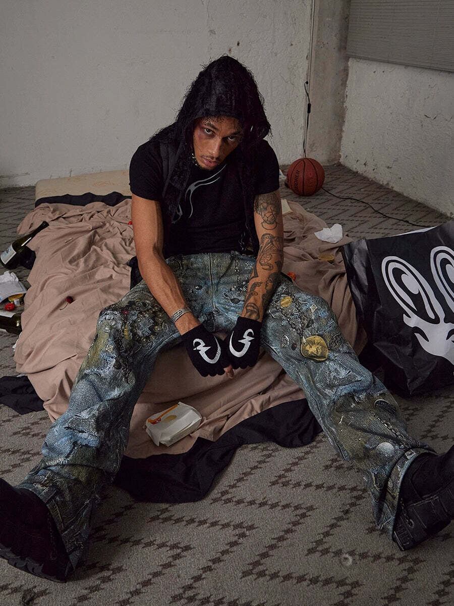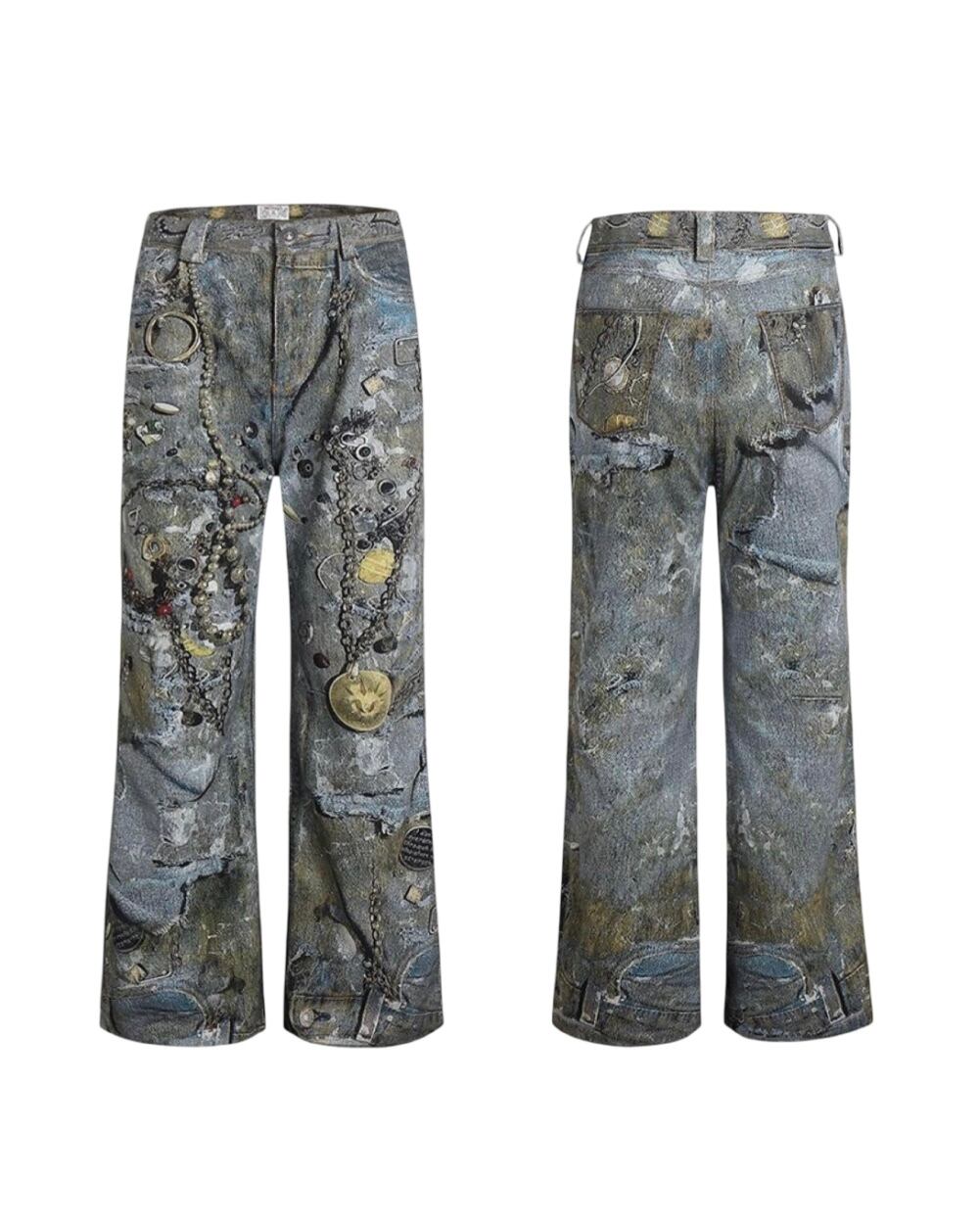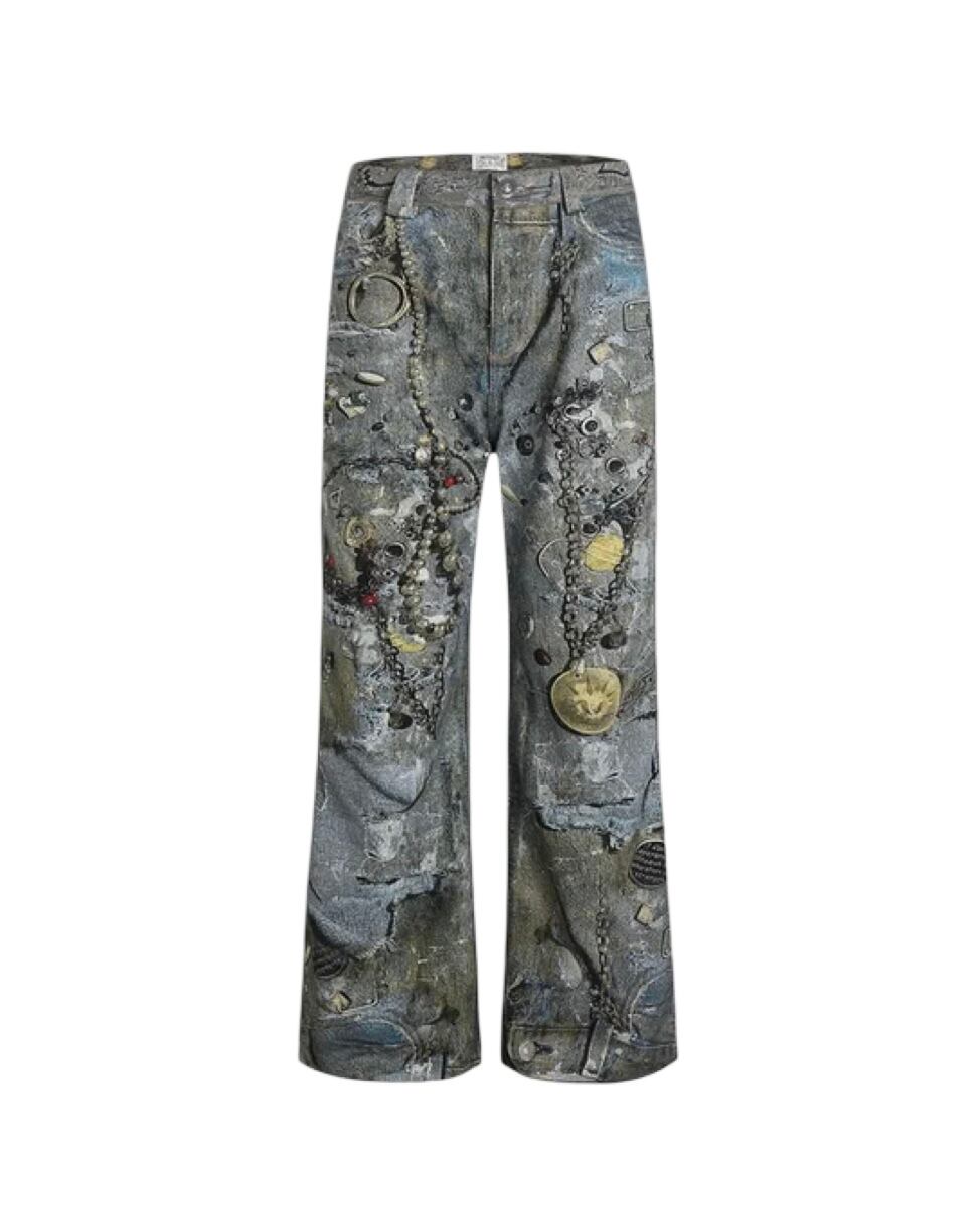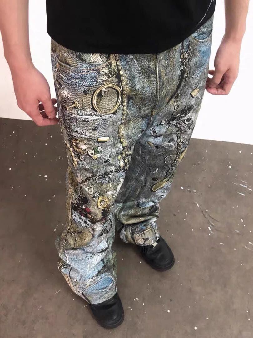 ハードなデザインがプリントされたジーンズ。チェーンなどがリアルで丁寧にフェイクプリントされたデザイン。